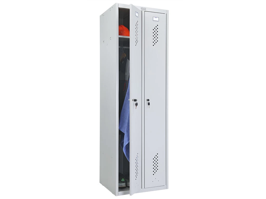 Среди достоинств шкафа следует назвать отверстия для вентиляции на дверях снизу и сверху, а также – специальные зацепы на боковых стенках, позволяющие скреплять локеры друг с другом и с боковыми секциями LS-001 и LS-001-40. Ещё одно полезное новшество в конструкции – двери можно установить справа или слева, с односторонним или распашным открыванием, благодаря чему шкафом удобно пользоваться в помещении любого типа и размера.