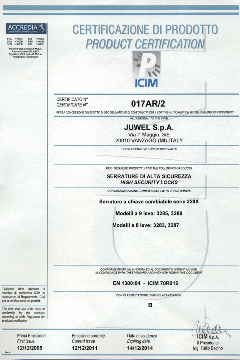 Сейф-тайник Juwel 5003 запирается итальянским ключевым замком Sercas, сертифицированным по строгому европейскому стандарту EN 1300 (class B). Замок содержит шесть сувальд и закрывается ключом с двумя бородками, что обеспечивает повышенный уровень секретности – 603 174 комбинаций. Когда замок не заперт, ключ не вынимается.