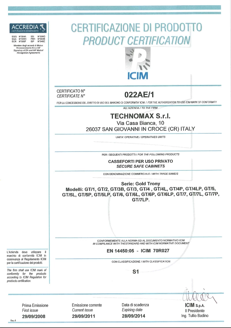 Совокупность этих факторов гарантирует исключительную безопасность хранения драгоценностей, денег и документов Сейфы серии Technomax отличаются превосходным качеством и известны своей надёжностью; об этом свидетельствуют европейский сертификат EN 1143-1 - GR.0, в домашних условиях предпочтительно держать в нём ценности на сумму не более трёх млн.